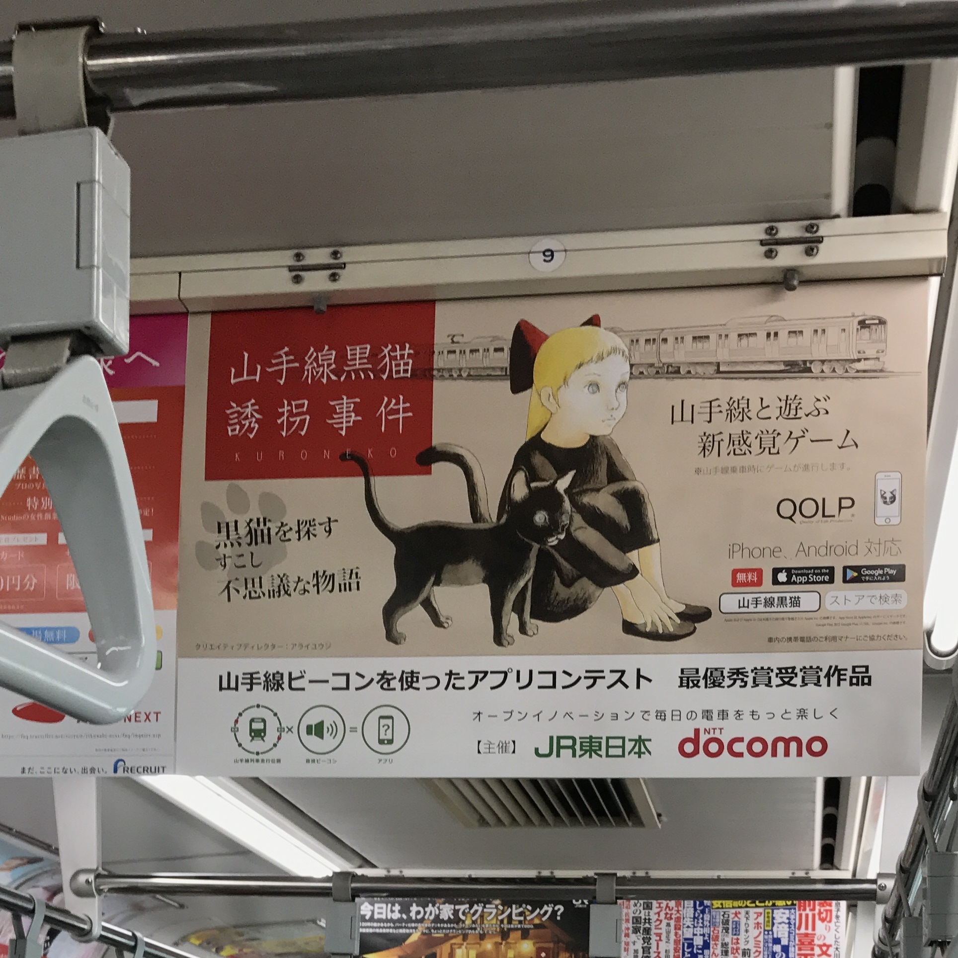 「山手線ビーコンを使ったアプリコンテスト」は、最優秀賞の賞品が、『山手線チェックインサービス(ビーコンを利用できるサービス)の半年間無料利用』と、『プロモーション支援』となっていまして、チェックインサービスの利用の方は9月1日から開始し、もう1つのプロモーション支援として、この中吊り掲出などを支援していただけるのです。