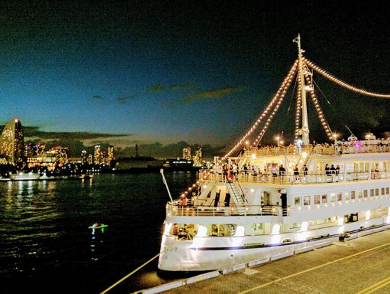 カクテルを片手に船上から眺めるとっておきの夜景も横浜ならでは。各フロアではダンスやライブ、豪華抽選会などを開催し、クルーズをさらに盛り上げます。
