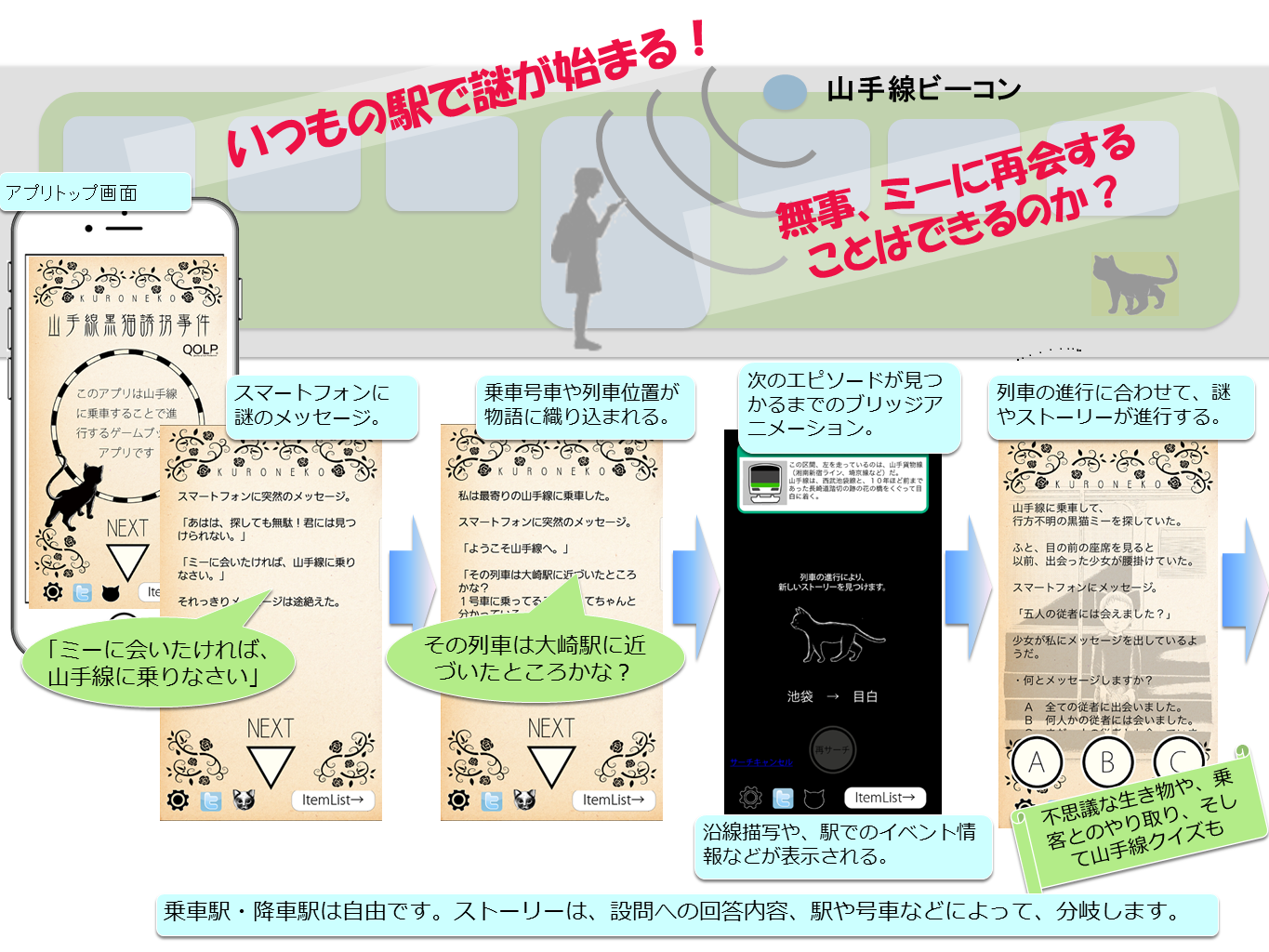 株式会社QOLP(東京都新宿区 代表取締役 草水美子)は、2017年9月1日に、山手線ビーコンアプリ「黒猫誘拐事件」を公開いたしました。